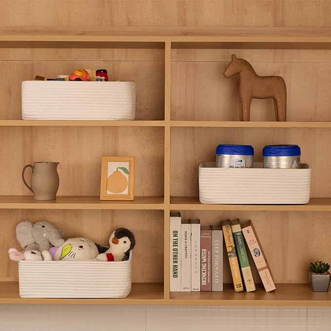 - [ Stylish & Versatile ]: Great for organizing small items on desks, in closets, wardrobes, or dressers—these cute baskets add texture to any living room, bedroom, or bathroom, appealing to fans of modern minimalist design