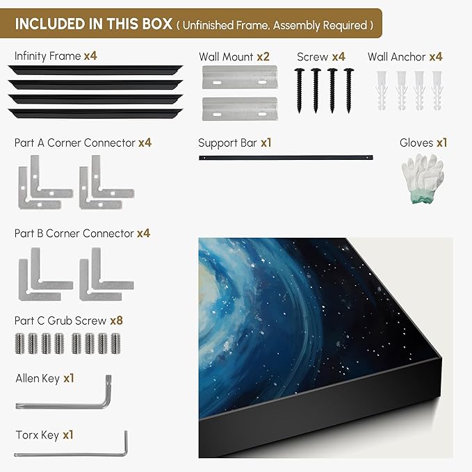 - Assembly Required: The artwork comes with the frame components unassembled. Don¡¯t worry - setup is straightforward and tool-friendly. For best results and accurate alignment, we recommend two people to ensure a smooth assembly and a stable, secure wall mount.