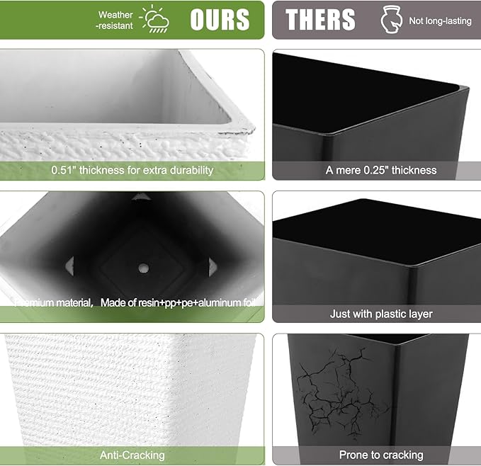 - Fed Up with Cracked Pots in the Sun?Sunlight and thin rims ruin planters fast.Our tall flower pots outdoor is crafted from durable resin+PP+PE with a 0.51" thick wall—built to endure UV and weather