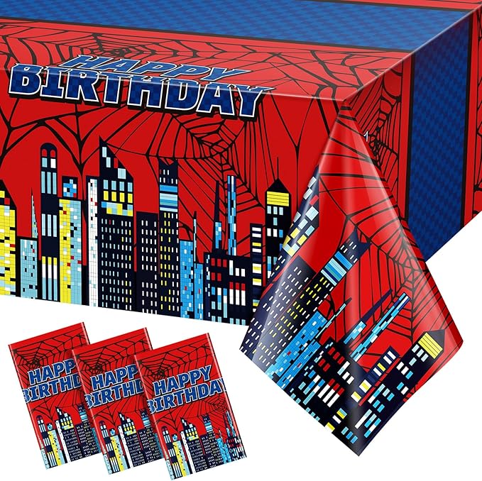 - Spider Party Design: Featuring a vibrant red and blue color scheme with spider webs and a bold city skyline, these birthday tablecloths add instant excitement to spider themed birthday parties or comic inspired events