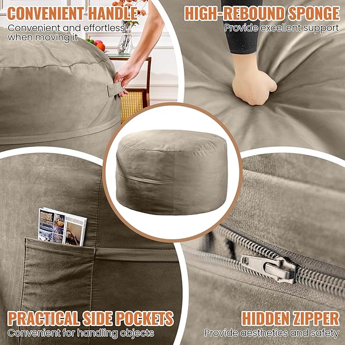 - CONVENIENT & PRACTICAL DESIGN: The bean bag features a side pocket for easy storage of small items like phones and books, as well as a handle for easy moving. Enjoy comfortable relaxation wherever you like.